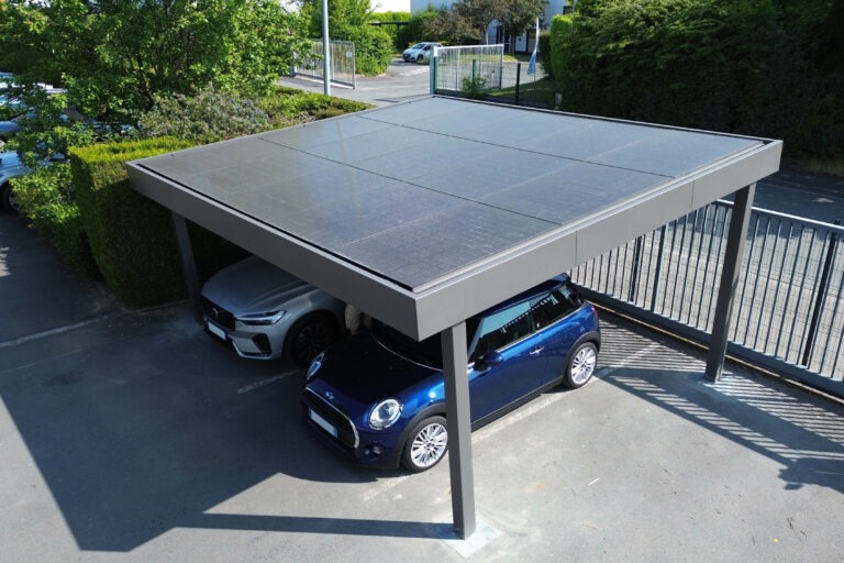 Découvrez le carport solaire, proposé par VANHECKE Outdoor, composé d’une structure en aluminium sur laquelle sont disposés les panneaux photovoltaïques.